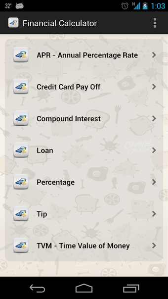 FINANCIAL CALCULATORS by AeHは、一般的な金融計算のためのシンプルで正確な様々な計算機を提供する無料のAndroidアプリケーションです。このアプリには、APR、クレジットカードの支払い、複利、ローン、パーセンテージ、チップ、および時間価値の計算など、合計7つの計算機が含まれています。使いやすいインターフェースで、ユーザーは迅速に計算を実行し、正確な結果を得ることができます。このアプリケーションは、Android 13.0以上に対応しています。